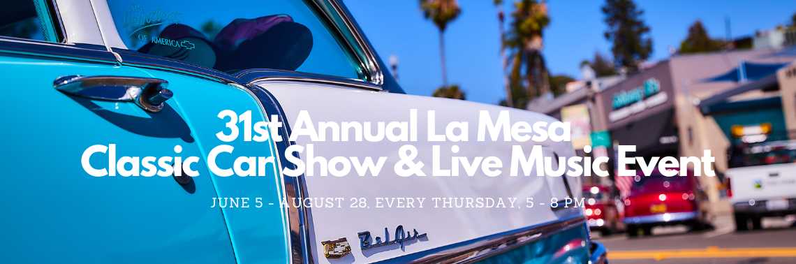 The 31st Annual La Mesa Classic Car Show & Live Music Event rolls into downtown La Mesa beginning June 5, 2025 - August 28th every Thursday from 5 - 8 pm. Visitors can stroll down La Mesa Blvd. to see beautiful classic cars, trucks, and vans (located between 4th St. - Spring St.) and listen to live music every week from local bands that play atop the iconic La Mesa Lumber truck "stage" located at 3rd & La Mesa Blvd. + a DJ, also from 5 - 8 pm!